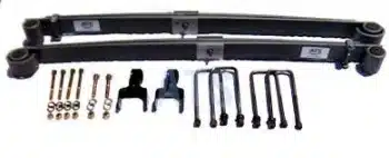 Complete front leaf spring kit for Ford F250 and F350 4WD trucks, including models with independent front axle (twin eye beam) suspension. Designed for (3″) wide front axle leaf springs, this kit restores your truck’s original ride height and factory ride quality. Ideal for both pickups and heavier-duty F250 trucks over 8500 lbs GVW, this complete kit replaces both sides of the front suspension with all necessary hardware included.