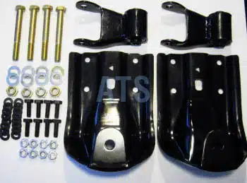 OEM replacement rear-of-rear leaf spring hanger and shackle assembly kit designed for Chevy Tahoe, GMC Yukon, and Cadillac Escalade models. This complete kit replaces both side hangers, shackles, and all necessary hardware for vehicles equipped with 2-1/2″ wide rear leaf springs. Direct bolt-on installation with no drilling or welding required.