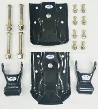 OEM replacement rear-of-rear leaf spring hanger and shackle kit for Chevy and GMC trucks and SUVs. Designed for 2-1/2″ wide rear leaf springs, this complete kit replaces both left and right side hangers and shackles, with all necessary hardware included for a direct-fit installation.